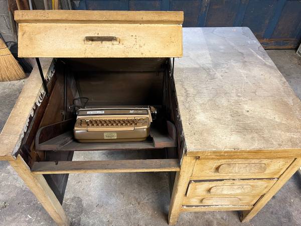 See video of how it works! Unique desk that flips up to expose typewriter. Fair condition, needs refinishing. Smith Corona typewriter turns on, tab bar works, but keys do not. I didn’t try to get...