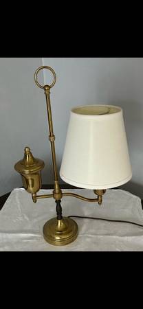 This is a vintage brass student lamp. It has electric plug and works. Likely circa mid 1900s. Comes with off white lamp shade and bulb. There is an oil reservoir or well with removable inner bucket...