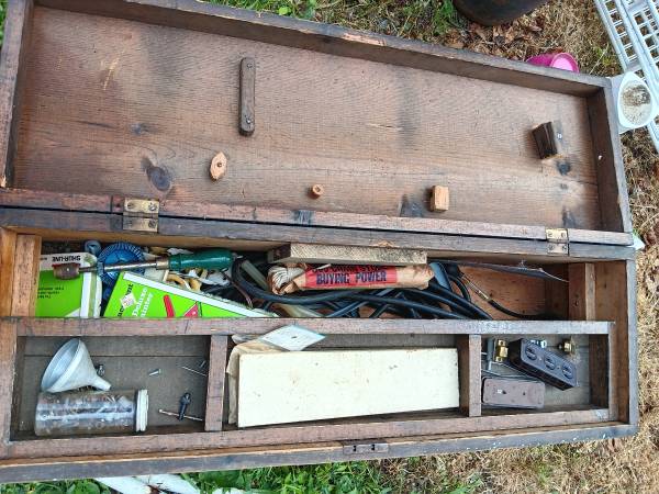 Old wooden tool box with tray and contents. Can meet in Hookstown or Robinson.