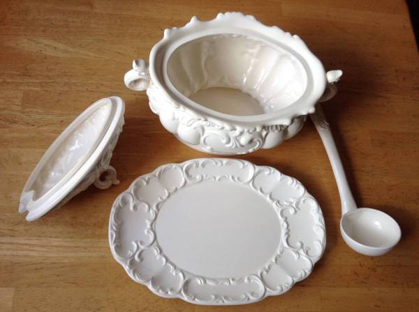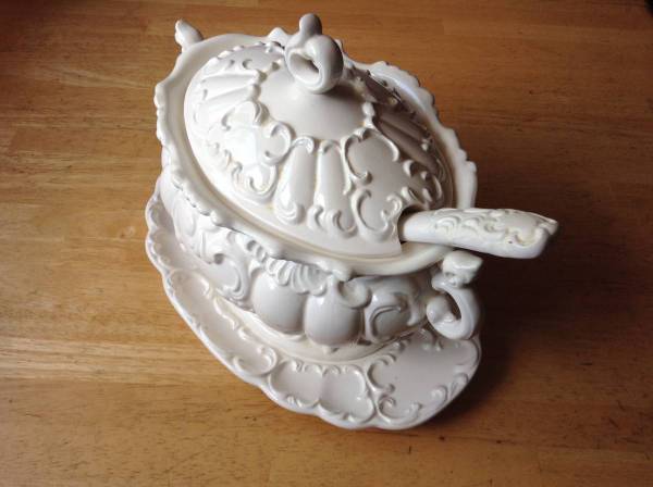 Antique white in color with a really beautiful design on it . It has the original matching platter , lid and ladle included . It comes just as you see it in the pictures .