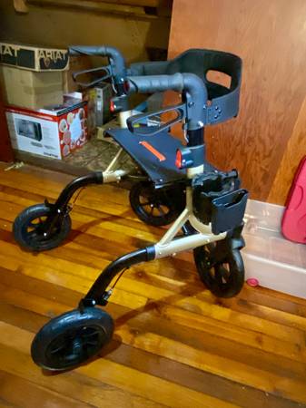 MaxWalk all-terrain rollator walker for seniors. 10” rubber wheels. Foldable walker with padded seat. Adjustable height. Like new. Never used