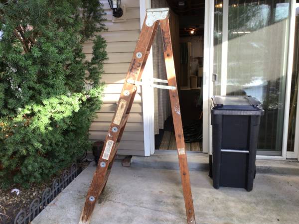 Six ft wooden step ladder, top 14” wide, top step 13”, bottom step 19”, very heavy & sturdy, good condition, always kept indoors, made by the Michigan Ladder Co. $25 cash only, no shipping,...