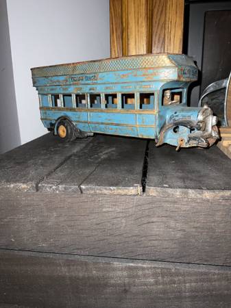 They made the toy in the 1920s. A large and impressive piece measuring 13-1/2" long. This toy is in overall good condition. Original paint is in good condition as seen in the pictures. Wear on the roof. Missing original seats. Original tires in back are in good shape for their age, front ones are missing. Bus driver is still inside on his seat.