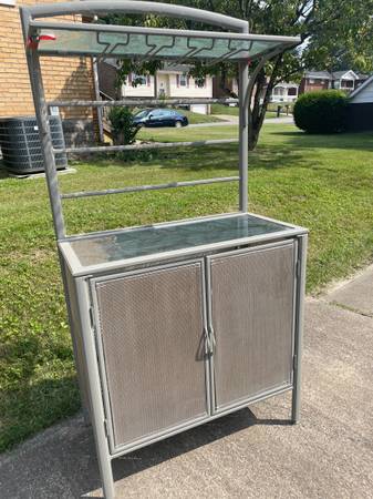 This is a great bar unit (could also be used as potting table). Made of aluminum and etched glass. $100. Also have matching tea cart $50. Tea cart sold! Must sell. Make offer. Now reduced to $75. 36...