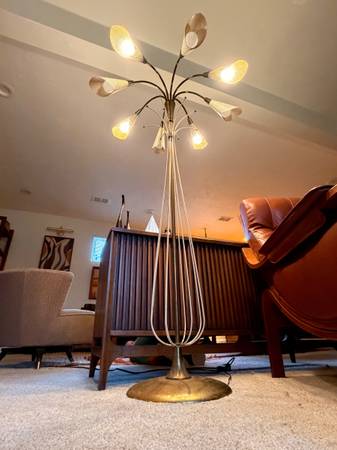 Maybe the most uncommon item to come through our shop. This atomic era lamp from Guggenheim is an absolute design triumph. Lamp is in phenomenal shape with some minor deterioration to the brass base and white painted accents. Lamp has a three-way switch which allows you to light up 4 lights at a time or all 8 at once. This is a lamp that will not come around often.