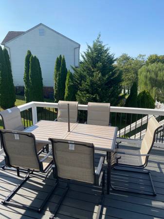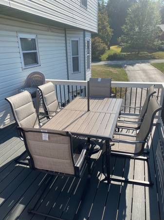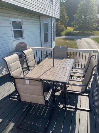 Like new deck/patio furniture set. Used only a few months this past season. Not in the photos, but included, is a matching umbrella. The umbrella base is also included. The table has been dissembled into an easily transportable size for hauling and put in its box.