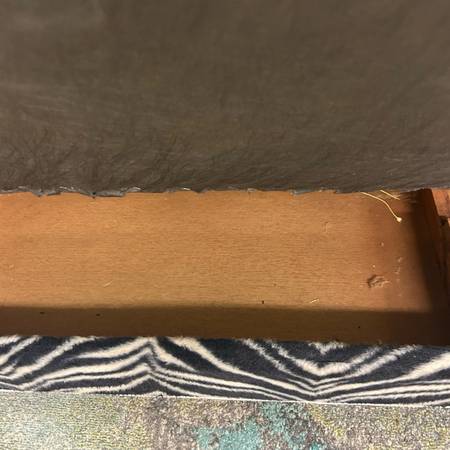 Excellent vintage condition. It was covered for most of its life. Blue and white zebra upholstery with white leather trim. Easy open and shut. It really is something!