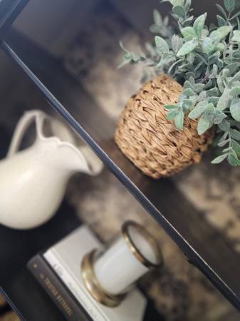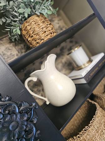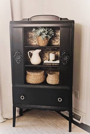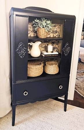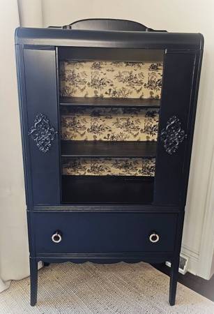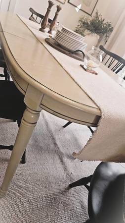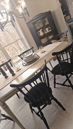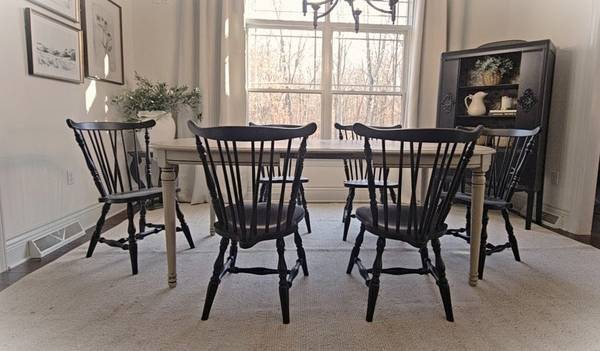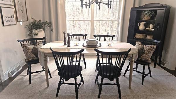 This is a one of a kind complete Farmhouse Style dining set. The set comes complete with a Bassett dining table in a neutral aged creamish color with black accents (one leaf included as shown but can be removed for a smaller table), 6 black farmhouse chairs and an beautiful and unique vintage farmhouse style display cabinet. The body of the cabinet is black with the back showing a vintage toile design in cream and black to co-ordinate with the table set. Decor not included. Cash only and local pick up.