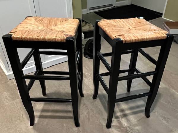Pottery Barn Bar Stools. Black wood and weaved top. Legs are scratched. Seats in perfect condition. Selling as a set. Reasonable offers considered. Meet at Walgreens in Carnegie.