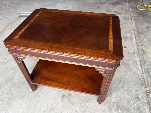 Wood end table, has a few nicks and scratches from years of use but still very nice. 20” x 27” x 22” tall
