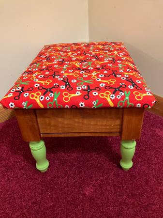 Decorative Stool/Sewing Box - w/storage compartment! Just recovered with brand new fabric! ✂️ 🧵 Legs were also painted a bright green! COST is $15.00. CASH ONLY PLEASE. Driveway pickup near FINLEYVILLE, PA 15332. (Nottingham Township)