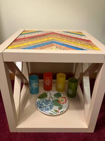 Decorative End Table! Great Conversational Piece!😊. Table top was decorated with a unique hand cut yardstick design and base was painted with a Lobster Bisque enamel paint! Bottom has plenty of room for storage. (Decor not included). COST is $50.00. CASH ONLY PLEASE. Driveway pickup near FINLEYVILLE, PA 15332. (Nottingham Township)