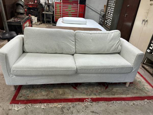 Nice neutral color sofa couch. Long 2 seater. Newer. Light gray/light tan. Measures 80 long 31 deep 34 tall 20 seat height. Pickup in Economy, few min from Cranberry