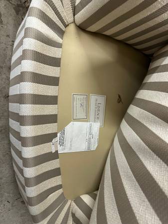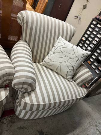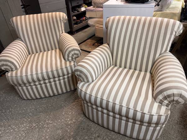 Pair of overstuffed, excellent shape, contemporary large chairs. Comfortable and cozy. Cream and beige colored. No pillows included. Price is for the pair. Will not split. **also have a similar Contemporary U shaped couch for sale separately.