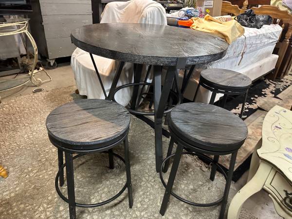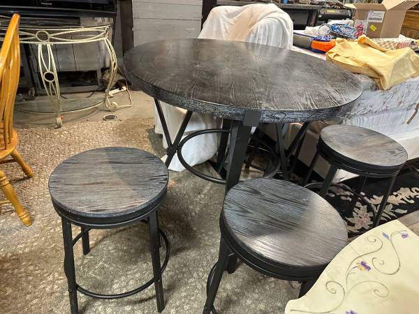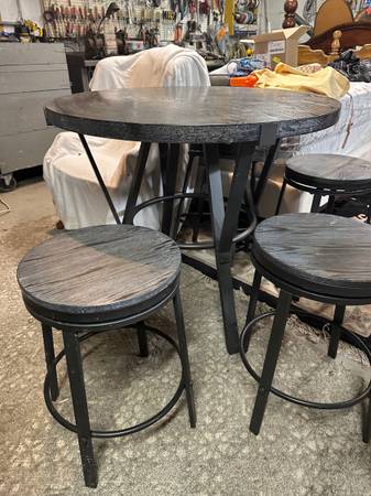 Gray and black pub top dining table with four swivel stools. In good shape. Is a distressed finish black top, was painted over the gray to be a bit darker. Normal used wear, no major damage. Table is 42 round 36 tall. Four stools 16 round 24 tall. Pickup in Economy, few min from Cranberry