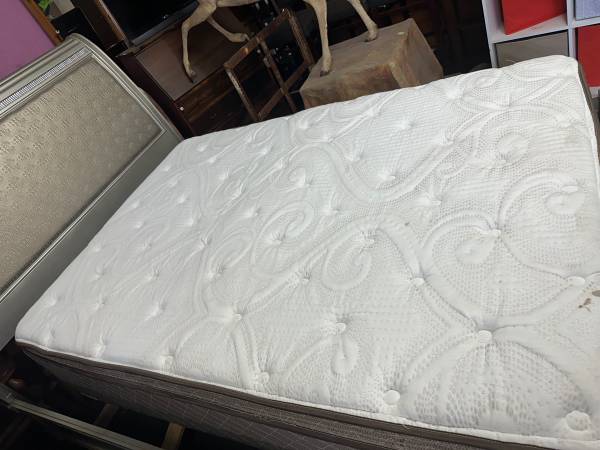 Silver bed - can fit both full size or queen size. Comes with a clean, full size mattress and boxspring. In good shape - silver can be repainted or touched up. Headboard has some pulls and marks shown in photos. Headboard is 56 tall, footboard is 18” tall. Pickup in Economy, few min from Cranberry