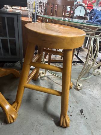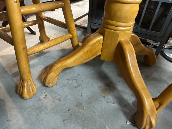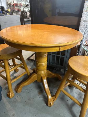 Solid wood, very thick and sturdy. Pub top table and 2 stools. Ball claw feet. Very heavy. In good shape. Measures 42 round 43 high 39.5 to bottom. Stools are 18 round and 40” tall. Pickup in...