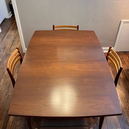Stunning top-to-bottom refinish of a late 1950s to early 1960s MCM classic. This 60”x40”x30” surfboard cut walnut Broyhill “Saga” from the Premier group needn’t ever play second fiddle to its sister “Brasilia”. Chairs not included.