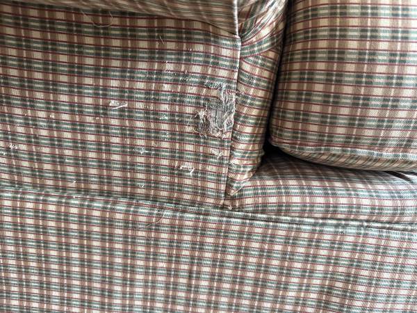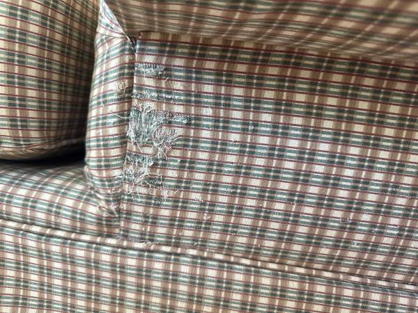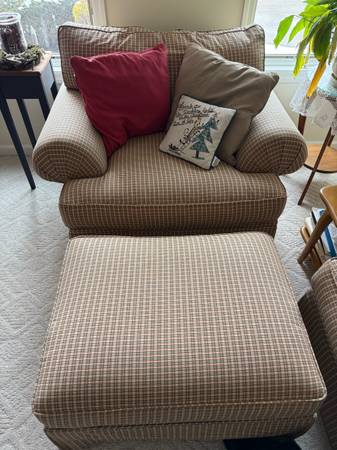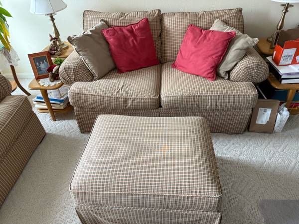 Well built, Craftmaster loveseat and chair and 1/2 and ottoman. Price includes all three. A few slight defects on the loveseat courtesy of our cats, but mostly out of sight. One pillow has some slight discoloration.