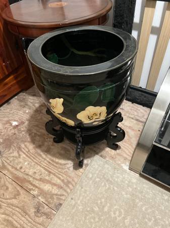 This is a large hand-painted black or porcelain Chinese fishbowl planter on a wooden stand. Sits on a black 13" stand.