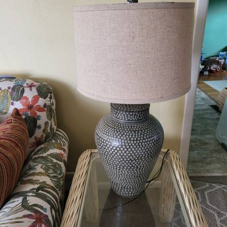 Attractive lamps have a large pottery style base. Includes shades About 32 inches high. Price is for pair of lamps.