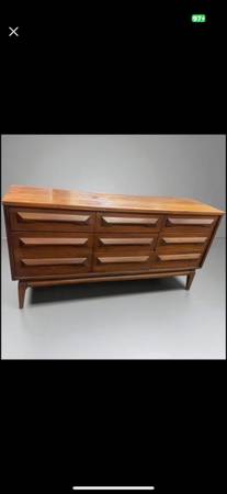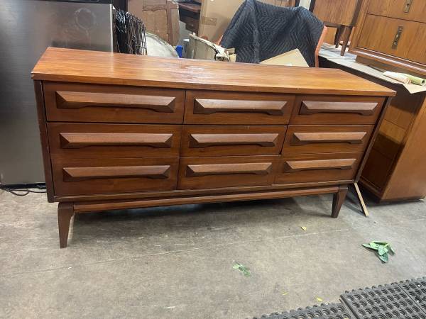 Measurements: 60L x 17.5W x 31H Stunning clean and crisp looking sculpted style midcentury modern unbranded nine drawer dresser. This is a great vintage piece with tons of storage and is a simple and classy statement piece. Ground floor (no stairs) pickup in monongahela 15063.
