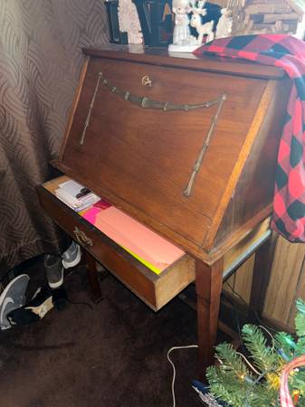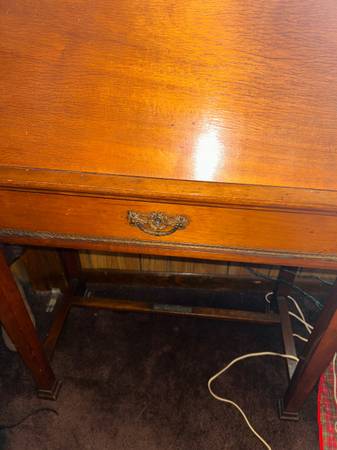 29.5" W X 46.5" L Sturdy wooden desk with drawer at least 70 years old. Has lots of life left in it and can be used for multiple purposes. Not too much wear & tear for it's age.