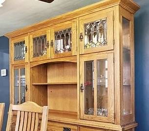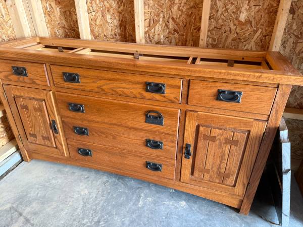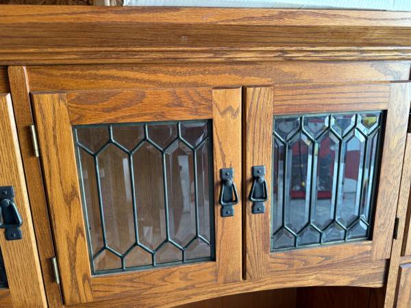 Solid oak dining room hutch - Richardson Brothers. Two piece hutch (64” by 18” deep by 82” tall) (base is 33” tall and top is 49” tall) has beveled glass doors in top with glass shelves and lights. Center of top section is open with a wooden shelf. Base has 4 center drawers (top has silverware insert) and two smaller drawers and door cabinets on either side. $800 cash, you pick up.