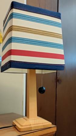 Beautiful table lamp with striped lamb shade and wooden base. Excellent condition