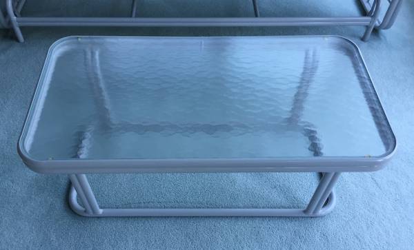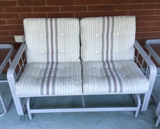 Gray Frames Extremely Comfortable Weather Resistant Lightweight Durable Group Includes: (1) 3-Seat Glider Sofa (1) 2-Seat Glider Loveseat (2) High-Back “Bouncy” Chairs (2) Glass-top EndTables (1)...
