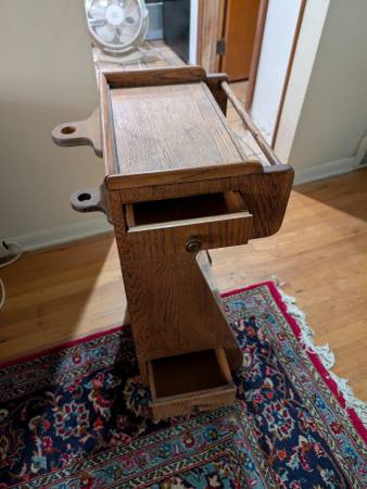 Solid wood custom made end table. Drawers and storage with a dowel to hang towels or other linens.