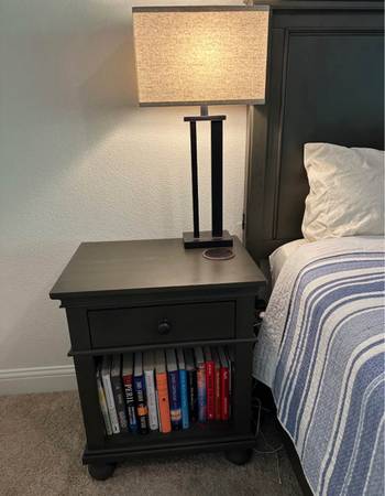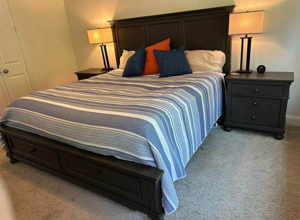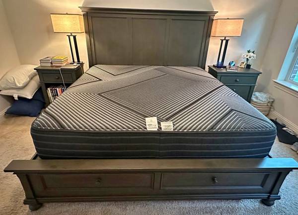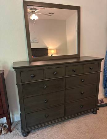 Only 1 year old in excellent condition. Mattress is in excellent condition too. 2 night stands, 8 drawer tall dresser (top left side for jewelry) with mirror & TV bracket (attaches to back if you want to use mirror elsewhere), 5 drawer dresser with pull out wooden rods on each side - will throw in lamps when purchasing everything!