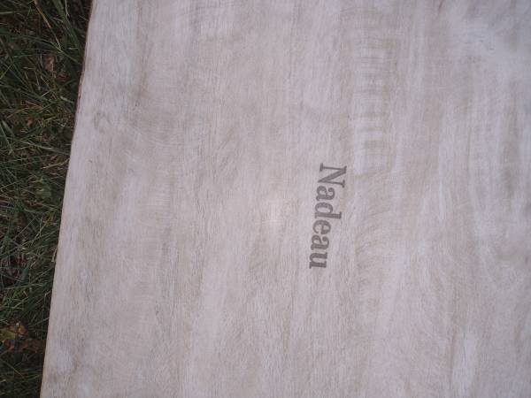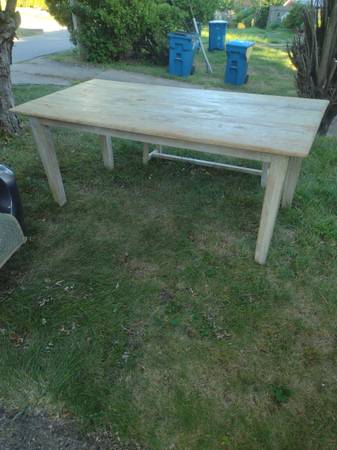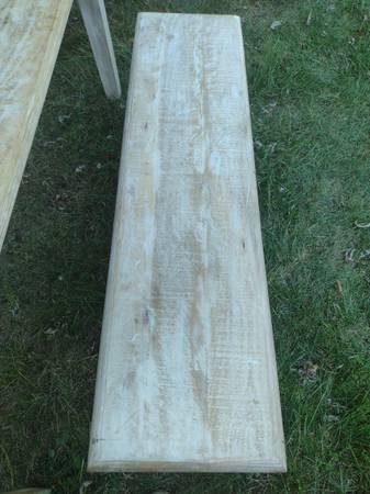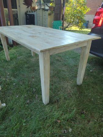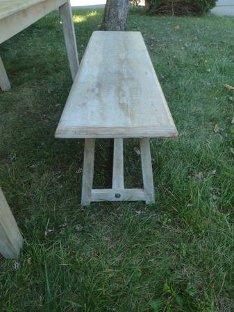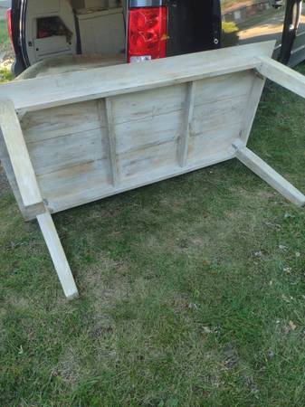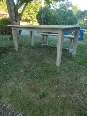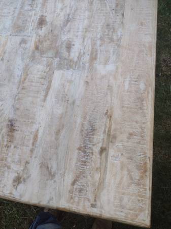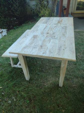 Nadeau quality rustic farmhouse table and matching bench for sale. Made in India or Indonesia of mango wood by Nadeau furniture company. Table measures 71" x 36" and 30" high. Bench measures 54" x 14" and 18 1/2" high. Delivery is available. Call Mike Penn Hills show contact info