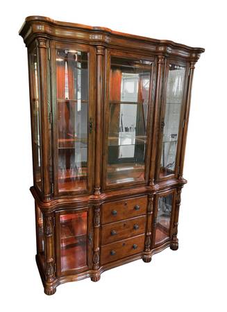 We do not have room for this very high-end, solid wood China hutch and Cabinet. It has beveled glass front "wave" doors, glass shelves, separate top and bottom light sets. Original cost was well over 2 grand - we've reduced it to $200. 2 pieces. VERY easy load from my garage. No steps. Loads right into your truck. You haul, but I can assist on this end only. Ashley is a very good name in the furniture business with a great reputation for long-lasting quality!