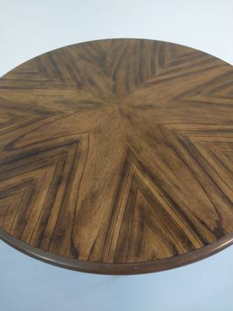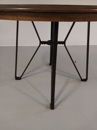 Beautiful round table, nice detail in top. Great size for extra holiday get together. Table top has been removed from base to make it easier to transport, we have all the screws to put it back on. The legs/base is not foldable so you need an suv.