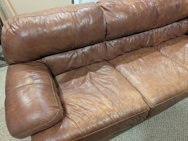 Older leather couch which is about 7.5 feet long, 3.5 feet wide, and 3.5 feet tall. The couch is older but still very comfortable. You can see the wear in the pictures.