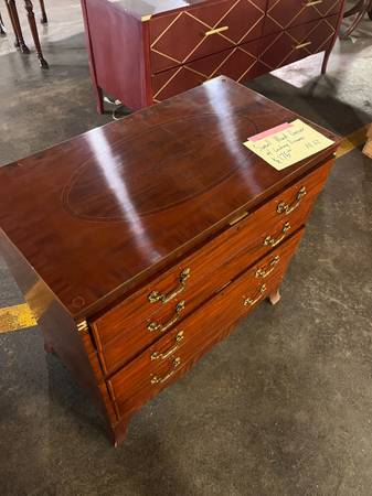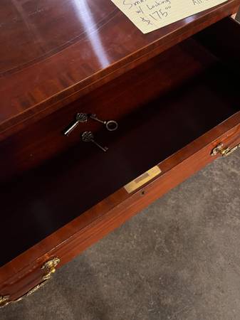 We have a Real Wood Dresser with Locking Drawers. Keys included. Finish is not perfect, but good for a spare bedroom. If you refinish it will be a nice piece of quality furniture.