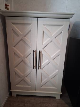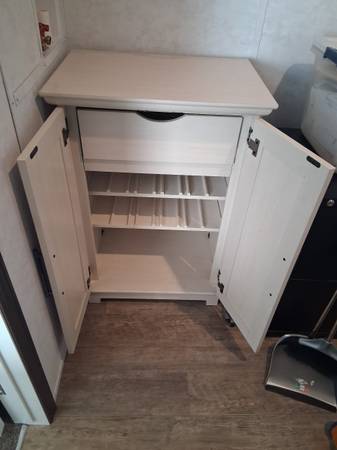 Coffee Bar or Wine Bar Use as a storage cabinet Antiqued White/off white in color 3 shelves and one pull out drawer Little water damage on the top. Contact paper will fix. Brought on Wayfair
