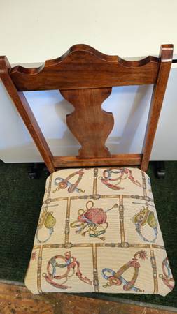 Walnut armless chair with upholstered seat with hound hunting themed fabric. Antique. Text 7two4-290-875six