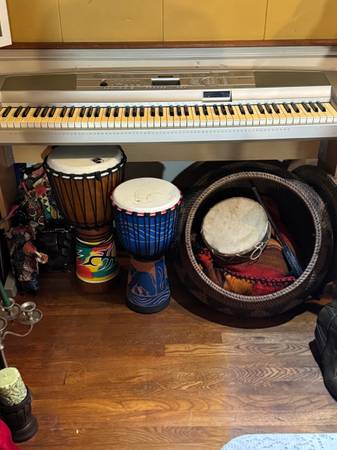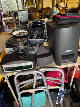 LUDWIG-ROYAL STAR 10 PIECE DRUM SET, YAMAHA YDD-60 DIGITAL DRUM KIT, FIRST ACT GUITAR AMP, SONY TV, JVC COMPACT DISC PLAYER, SONY DVD PLAYER, JVC CASSETTE PLAYER, OPTIMUS SPEAKERS, WICKER STOOLS, ROUND WOOD AND BRASS ENDTABLES, LADIES, HUNDREDS OF CASSETTES, DVD'S, CD'S AND VHS TAPES, LADY HEAD WITH A WIG, ANCHOR 9 PIECE BAKESET, PACER TREADMILL, LINENS, BED COMFORTORS, HAT BOXES, BADMINTON SET, AFRICAN ARTWORK, PORTABLE HEATER, AMISH BOOKENDS, VINTAGE ICE BUCKET, MILK GLASS, CROCK POT, WATTERING CANS, LOTS OF STORAGE BAGS, CHILDRENS CHAIRS, TOOL BOX, ASSORTMENT OF DISHES, LADIES BOOTS, WOOD CHIPS, BROTHER SEWING MACHINE, FOOT STOOLS, WALLART, WICKER BLINDS, KITCHEN ITEMS, AFRICAN WOOD STATUE, LAMPS, MIRRORS AND A LOT MORE