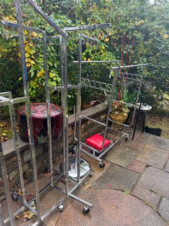 YES-FLOWERS IN POTS ARE FOR SALE, ORNATE METAL CHAIRS, ALUMINUM PATIO TABLE AND CHAIRS, INDIVIDUAL POTS, DRESS RACKS, UMBRELLAS WITH STANDS, EXERCISE BIKE, WHEEL BARROW