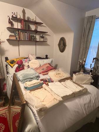 Antique photos, antique desk, queen bedroom set, accent tables, lamps, holiday items, clothing, storage cupboards, textiles, queen 4 poster bed, antique brass double-sided footed vanity mirror, mahogany end/magazine table, secretary desk, Early American Pattern Glass Bowl, Wood kitchen table, hutch, desk, refrigerator, stove, Pyrex - all in second floor kitchen and much, much more.....