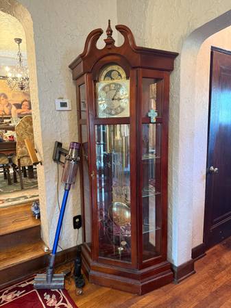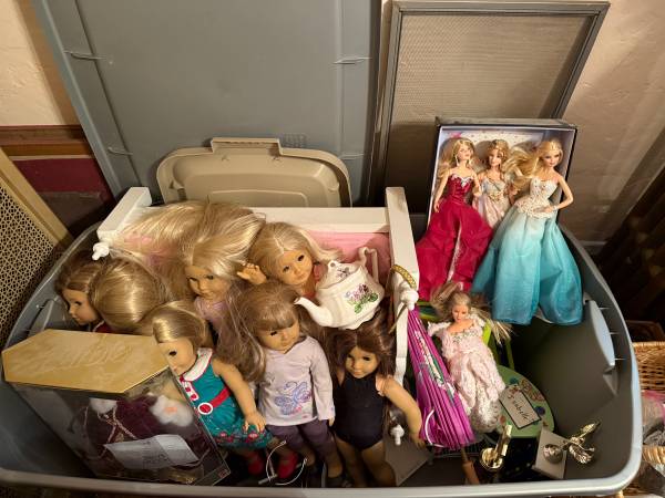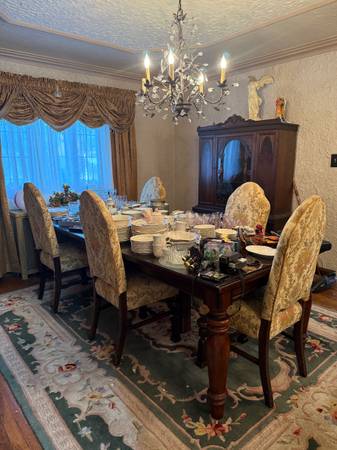 Very long dining room table with upholstered chairs, perfect for entertaining. Living room furniture, antique marble top dressers, leather massage chair, small antique accent table, bedroom furniture, display cabinet, large grandfather clock with display cabinet, small upright clock with display cabinet, McCoy vase, pottery and vases, collectibles, christmas decorations including two large nutcrackers, vintage traffic light, American Girl dolls, and Barbies