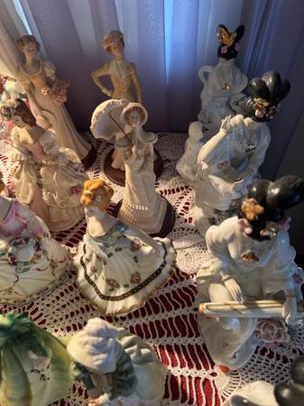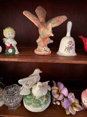 SWAROVSKI ITEMS, PORCELAIN LADY FIGURES, PORCELAIN BIRDS, MATCHING QUEEN ANN END TABLES, BOSE CASSETTE/ AM/ FM STEREO, GLASS AND BRASS END TABLE, ORIENTAL CABINET WITH RAISED FIGURES, FULL SIZE FLORAL COUCH, TALL LENOX ANGELS, PECAN DINING TABLE WITH 6 SPINDLE BACK CHAIRS AND 3 LEAFS, MATCHING TEA CART, MATCHING HUTCH, FIESTA, NORITAKE CHINA SET, PRESSED GLASS CANDY TRAYS, CRYSTAL STEMWARE, LOTS OF CHINA SERVING PIECES, KITCHEN HAS A SELECTION OF COFFEE CUPS, POTS, PANS, BAKING ITEMS, HOUSE PHONES, GLASS AND BRASS CURIO IN THE FRONT LIVING ROOM, GLASS-POTTERY-METAL SERVING ITEMS, DINETTE TABLE AND 4 CHAIRS, FULL SIZE DRESSER WITH MIRROR, LINGERIE CHEST, CURIO WITH CURVED GLAAS SIDES, COLLECTION OF ANGELS, CUP AND SAUCER RACK, SWIVEL ROCKER, MORE CLOTHES, AND A LOT MORE TO BUY AT 75% OFF