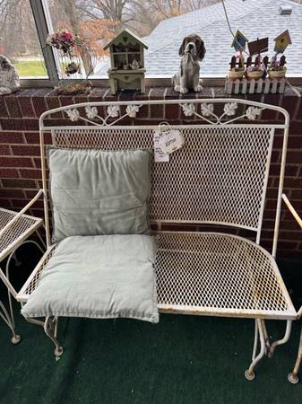 ROUND TABLE WITH 4 CHAIRS, PATIO ANIMALS, SET OF 6 CHAIRS WITH END TABLES, HANHING OAK SWING, NEW TWIN SIZE MATTRESS WITH BOX SPRINGS, GARDEN TOOLS, BEDROOM BENCHES