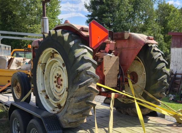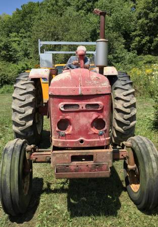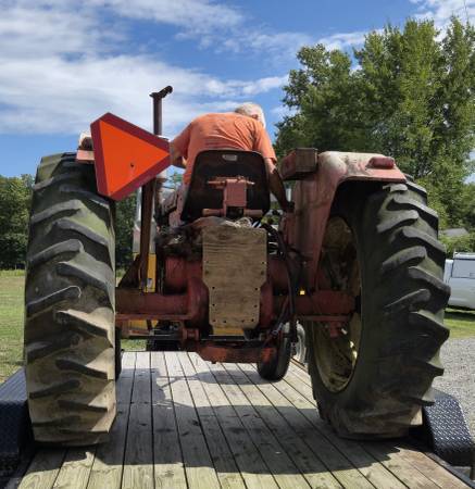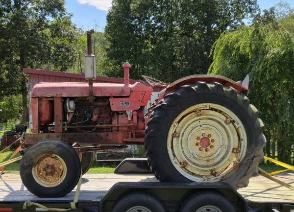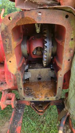 Rear three point hitch arms, lift pump, battery, and other parts are missing.