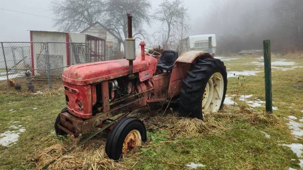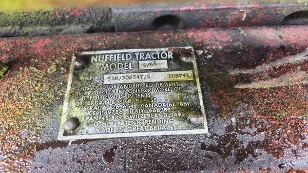 Nuffield model 4-65 diesel tractor. Has missing parts and needs repairs, or could be used for a restoration project. Rear tires are bad, would need replaced if tractor is restored. Radiator leaks. Tractor will start and run on it's own with your battery. Wiring harness is burned up. Will need a battery.