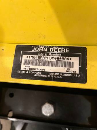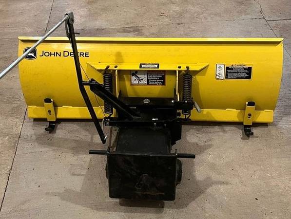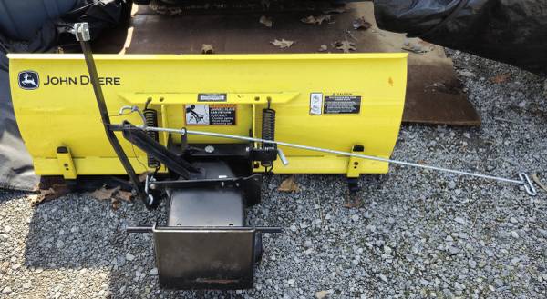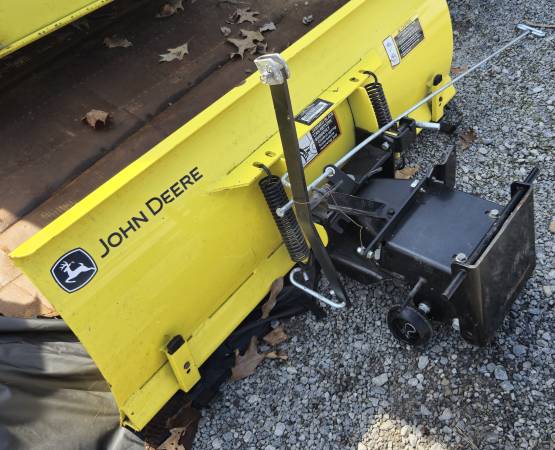 It's available John Deere 48 inch snow plow in like new condition. Fits X500 series riding mowers before 2016. Angling lever included. 4 Weights and tire chains can be included for full asking...