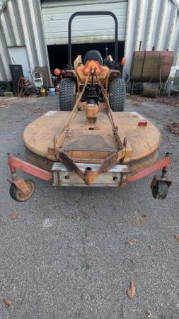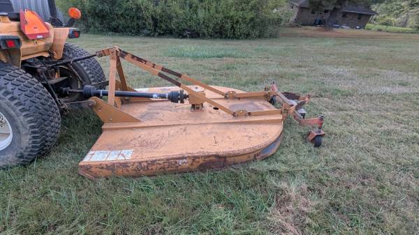 Heavy 6' brush hog. Woods Brushbull. Too heavy for my Cub Cadet 7300 to handle on my hilltop property. Runs a little rough to put behind my bigger Yanmar. The previous owner redesigned the tail wheels but it could be put back to a single. He owned a welder but obviously didn't know how to weld. Its ugly but it mows. Call/text seven242five5four3four7. I rotate shifts and sleep odd hours but will get back to you.