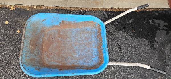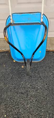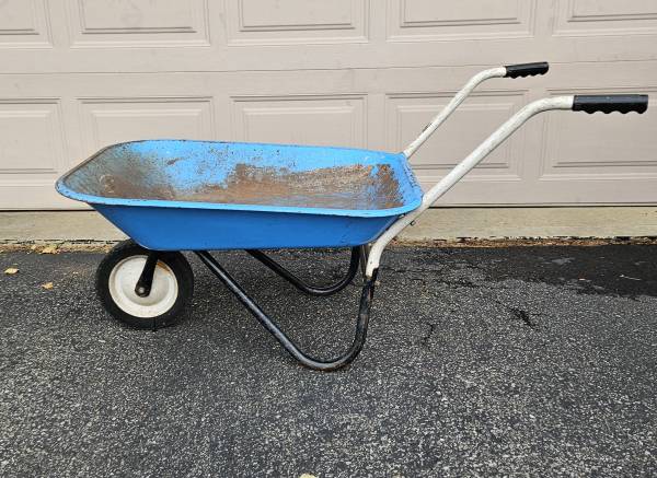 Very sturdy metal wheel barrow in really nice shape. Rubber wheel, comfortable grips on the handles. Ready to go to work.